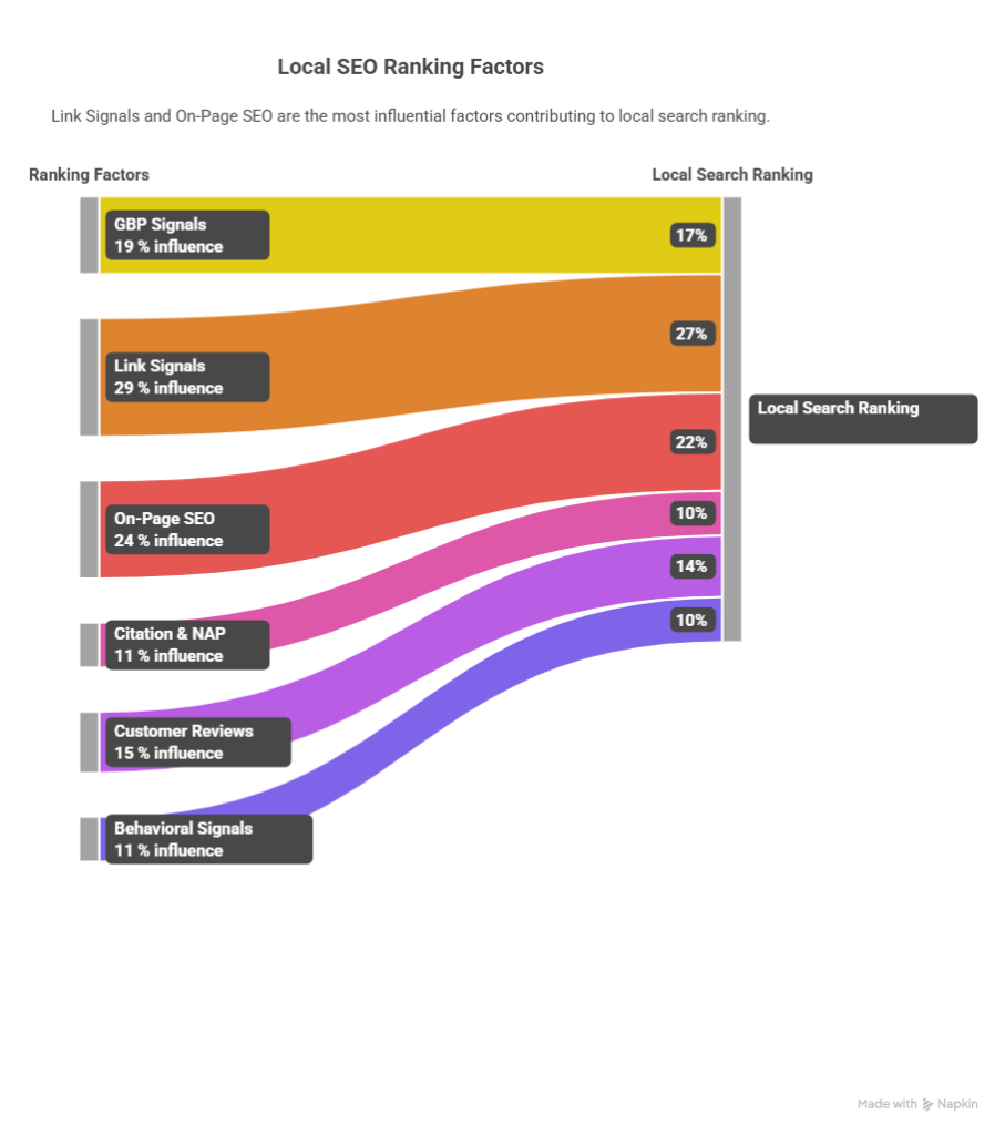 Backlinks remain the largest single factor for local organic rankings, accounting for roughly 29% of the signals Google evaluates, according to Moz’s research. While your GBP matters enormously for Local Pack visibility, the organic results beneath the map pack are heavily influenced by traditional link-building signals. Businesses that earn links from relevant local directories, news sites, and industry publications consistently outperform those that focus on GBP alone.