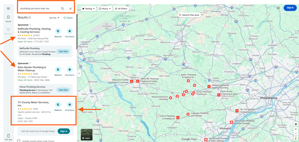 Take a moment to search for “plumbing services near me” in a densely populated area and observe what happens. You’ll see sponsored ads at the very top of businesses that are paying for that spot. Below those ads, the Local Pack appears with its map and three businesses. But scroll just a little further, and you hit the organic results, and that’s where things get genuinely interesting.